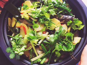 最后撒上葱段和香菜就好了。锵锵锵,重新换了个锅,煮开着吃,让鱼更入味