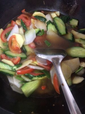 然后倒入配菜翻炒片刻,加入适量的盐,蚝油和水煮开后倒入烤鱼上