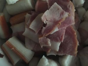 培根炒出油后依次放入焯熟的主料