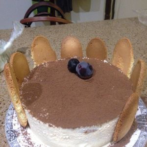 取出冻好的蛋糕,筛上少量可可粉,周围放上手指饼做装饰就大功告成了。注意:可可粉适个人喜好选择分量,并且一定要过筛。