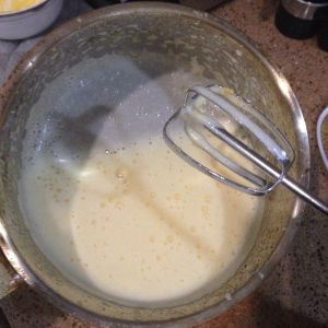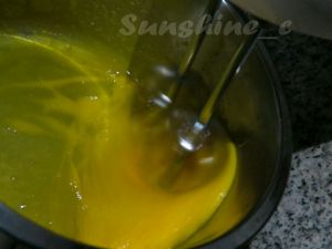 将泡好的吉列丁隔水融化倒入鸡蛋糊搅拌均匀。
