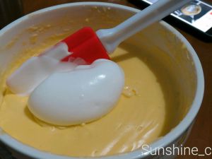 1/3打发的蛋白和蛋黄糊翻拌均匀,再全部倒入蛋白用,从底部向上的方式拌匀。