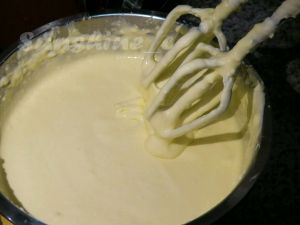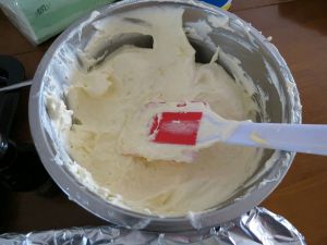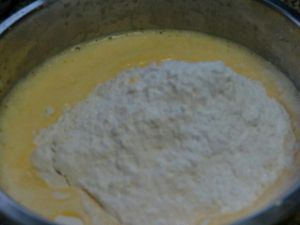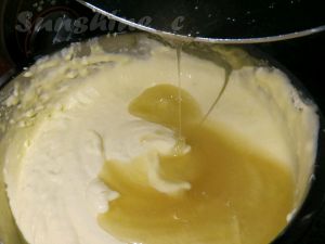干酪搅拌顺滑和蛋黄糊混合均匀。