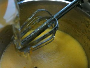 鸡蛋、糖、香草籽混合,隔水加热并不断打发至颜色发白体积膨胀,温度控制在60度左右。