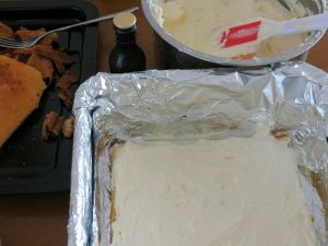 朗姆酒和咖啡混合,蛋糕切成两片,底层放一片蛋糕,抹上咖啡朗姆酒,再抹上一层奶酪糊。
