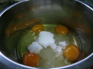 鸡蛋全蛋打发后加砂糖继续打3~5分钟