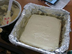 倒入一半奶酪糊震实