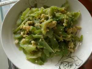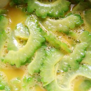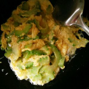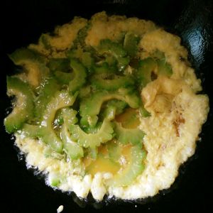 热油炒苦瓜,爆炒五分钟加入鸡蛋加味精盐爆炒。装盘