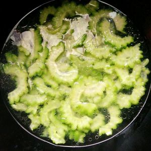 锅里烧水,水开后加几滴玉米油和少量盐,再放苦瓜(苦瓜焯水,是让苦瓜减少一点苦味,放油和盐,能让苦瓜颜色变得翠绿)