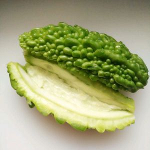 苦瓜切半,取掉瓜瓢,切片。洗干净,待用
