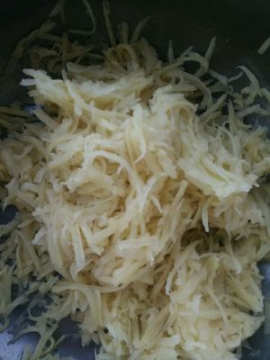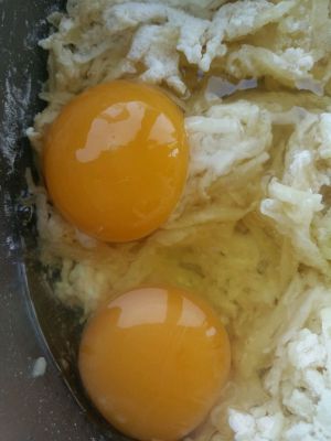 把土豆切成丝状,加鸡蛋,做成饼状,