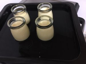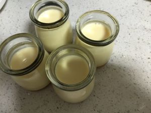 最后倒入制作好的布丁液,水浴法烘焙,热水一定要没过布丁瓶一半的高度,不然会有气泡的。我是放在椭圆模具里的,烤盘还是没有这个高度,有2个是高的瓶子,热水没有达到一半高度,烤好后上面有一层小气泡,所以怎么样水浴烤,自己好好想想哦~
