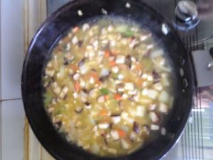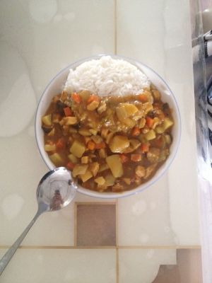 锅底放油,油热放切好的洋葱和土豆,炒一会放入鸡肉继续炒。加入水,水超过菜即可。水开放牛奶,糖,盐,放入买好的咖喱块3块。