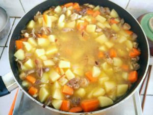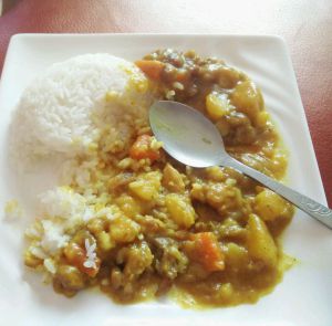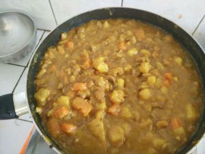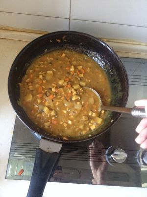 土豆胡萝卜差不多熟时放咖喱块,等咖喱块融化,蔬菜入味即可出锅