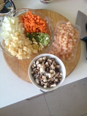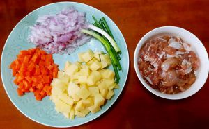 洋葱、土豆、胡萝卜切小块,鸡腿分解切块并加料酒、糖和生抽腌制1小时,准备葱段,米饭蒸熟待用。