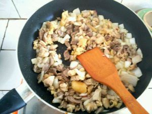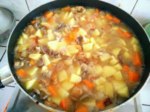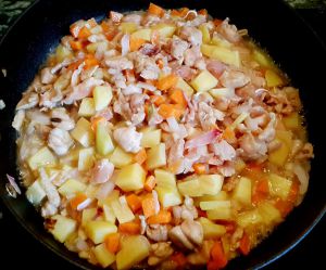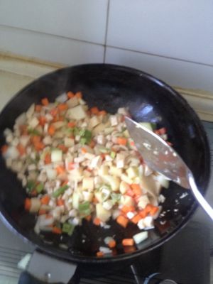 锅中入油,把鸡块滑入翻炒至变色。加入土豆胡萝卜洋葱继续翻炒,至7~8分熟时加水焖炖