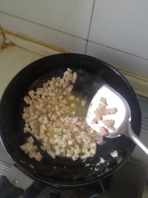 鸡腿肉切丁开水焯一下去腥,捞出水沥干(这一步在开炒时准备好 )