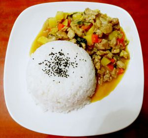 摆盘:米饭盛碗倒扣盘中,咖喱鸡汁浇在一旁,米饭上点缀黑芝麻。