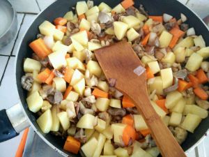 先炒土豆胡萝卜,变金黄的后洋葱下锅,炒出香味盛出备用