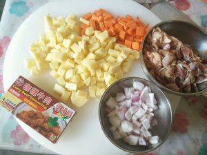 热锅下油,姜蒜粒和葱头爆香,下洋葱超香,加入腌好的鸡肉,大火炒至微变色,放土豆和胡萝卜块。加蚝油、盐和水(稍没过食材)焖煮一小会,咖喱块加入继续煮至熟,鸡精调味,加葱粒。