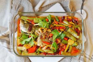 剩余炒料切好,将鱼送进预热210度的烤箱,烤25-30分钟,视鱼的大小自行定夺。