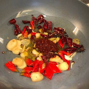 开始炒料,热锅下油 按个人喜好倒油,我不想太油腻所以没倒特别多,但其实油多更好吃。姜蒜 干辣椒 花椒 泡姜 泡椒 野山椒 豆瓣酱全部下锅