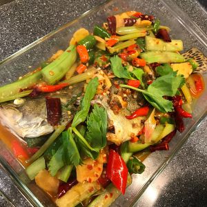 烤鱼的同时炒配菜,锅里放入适量玉米油,加葱、姜、蒜爆香,再加入适量火锅底料炒一会儿,加入泰式甜辣酱,黄瓜、芹菜段,炒好后加入适量水,再加入花椒烧开,黄瓜五成熟时加入洋葱煮一会儿,最后加入韭菜段,这时锅里的水分也收得差不多了,放入适量盐和鸡精调味