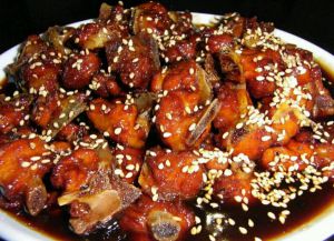 最后把刚才那油炸过的排骨倒入调过的汁中,小火闷到排骨把那汁水浓缩在排骨上有光着则可以了