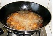 锅中放油烧至六成热,下排骨炸至淡黄色捞出 油温加热至八成,再下锅炸至金黄色捞出