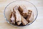 排骨坎成这样的形状,然后用冷死冲洗5分钟,在然后用油炸成这样的形状。