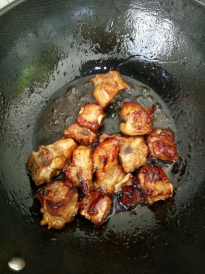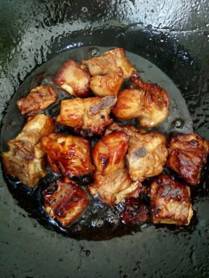 加入油和少量冰糖熬成琥珀色,加入排骨上色