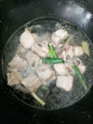 排骨洗净,锅中放入水,把排骨下里面,放入姜片,蒜苗,料酒烧开。