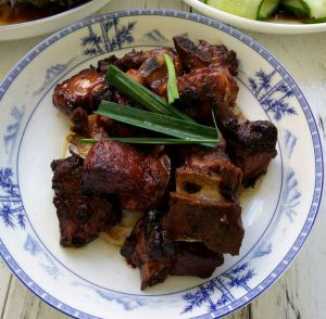 再将入水淹没排骨的量,再加入少量酱油、黑椒汁、打结的小葱。将排骨煮到烂熟