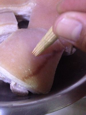 煮熟捞出用一把牙签扎猪皮放油