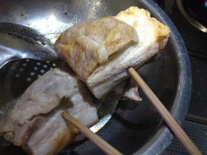 锅中放油,这个过程没怎么拍,因为怕油溅伤手。油温五层热,猪皮先下锅,注意有油会溅出,拿锅盖挡下,下锅后,五分钟拿勺子把油浇到另一面上,十分钟翻一次肉,