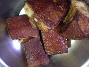煮熟后捞出抹老抽,下油锅炸猪皮发金黄即可