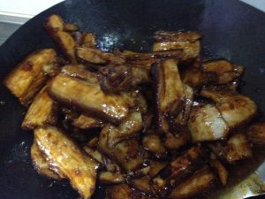 锅里留少量油,放适量白糖,小火熬成焦糖色后放入大方块五花肉上色,后加适量黑酱油再次上色后,放点水,放点盐,捞出把肉切薄片装到要蒸的大盆里面,摆好后,肉上面放一层梅菜