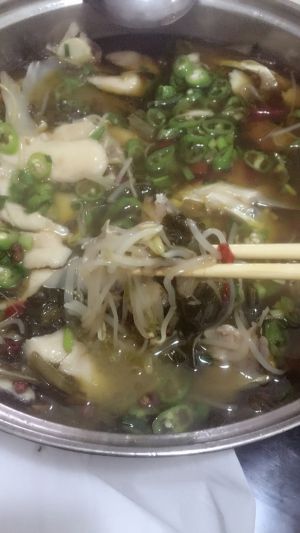 我加了豆腐,夏天吃很开胃。鱼片用蛋清生粉料酒腌好,可以放入料包中的调味腌制,葱姜蒜下锅煸炒,放酸菜包,一起炒,下开水,水开,鱼片轻放入,煮三四分钟,出锅。