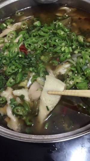 跟着放蒜,姜,泡椒,花椒,酸菜,大火3-5分钟