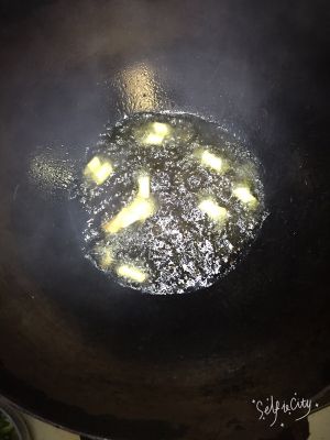 热油加入姜蒜酸菜泡椒翻炒,然后加入鱼头,鱼骨,一起翻炒。