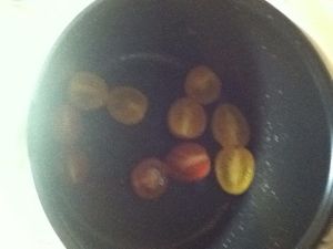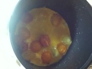 圣女果放进有少量沸腾的水的电饭煲,焖一会儿,翻炒出番茄汁