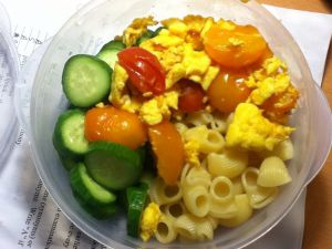盛到放有黄瓜片和通心粉的碗里拌一拌开吃