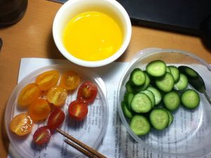 圣女果切开,鸡蛋加盐打成蛋液。忽略误入的黄瓜。。。它要坏了,是为拌意面吃的