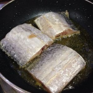 锅中倒油,温热后将带鱼块逐个放入,煎至两面金黄。