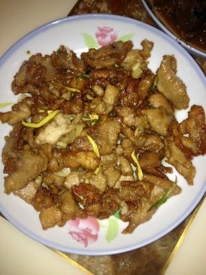 炸至金黄捞出后再炸另一部分,炸好的肉片再复炸一次,这样肉片酥脆