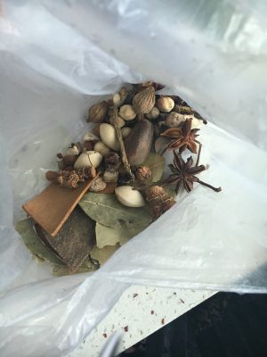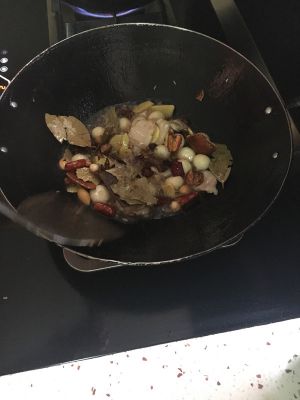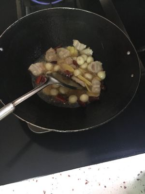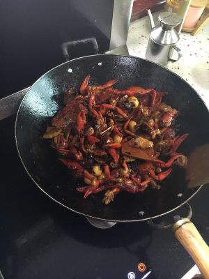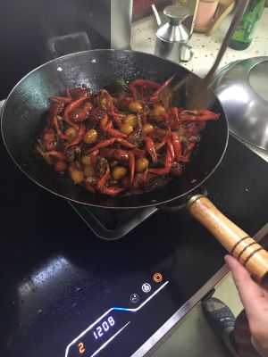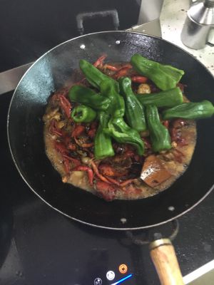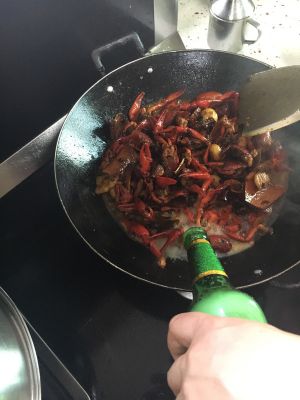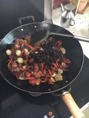 放入对虾、葱姜蒜、以及料酒、耗油。大火收汁。