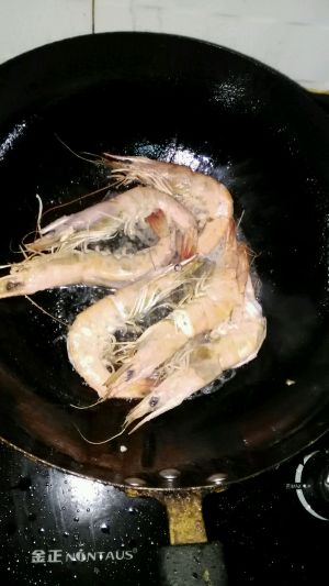 3.热锅倒油、比平时炒菜多一点就可以。把大虾摆进锅里小火两面煎出虾油。捞出放一边备用。