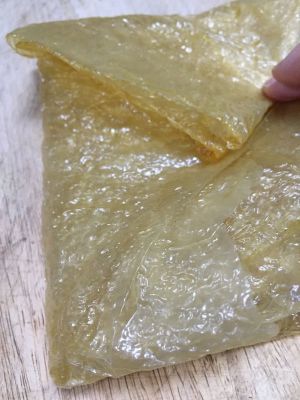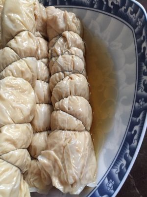2勺生抽,半勺老抽,1碗水,将捆好的豆腐皮浸泡1小时左右直至变软