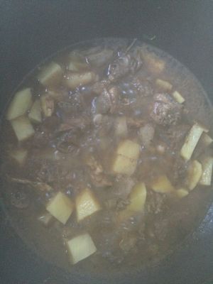 等汤汁变溶时把土豆倒进去、(看个人口味,可以放香芋、等、也可以不放)继续焖锅。