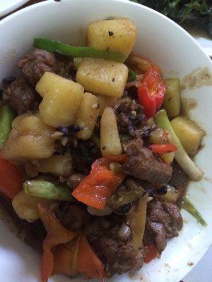 等土豆熟了。就把这些放进去。还有豆咝。不要停的翻炒,试一试味。看看要不要调一下。